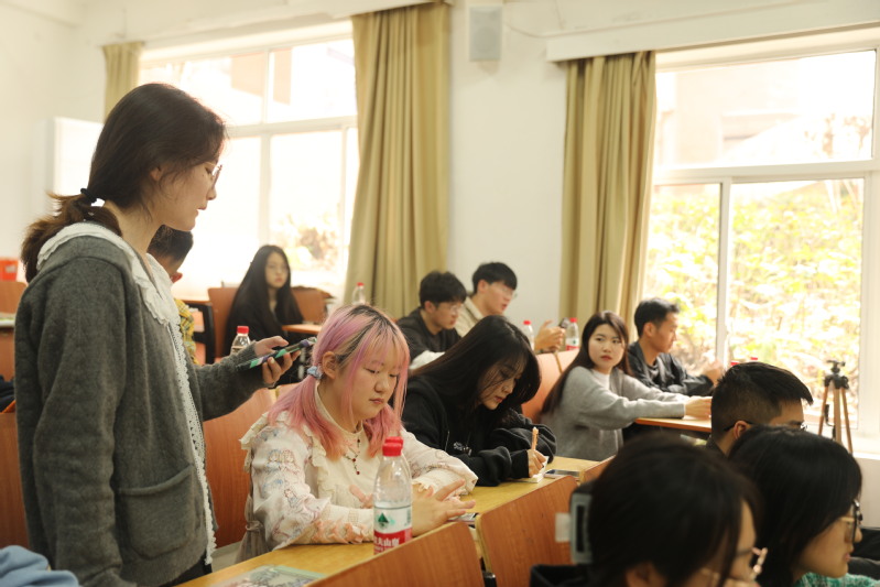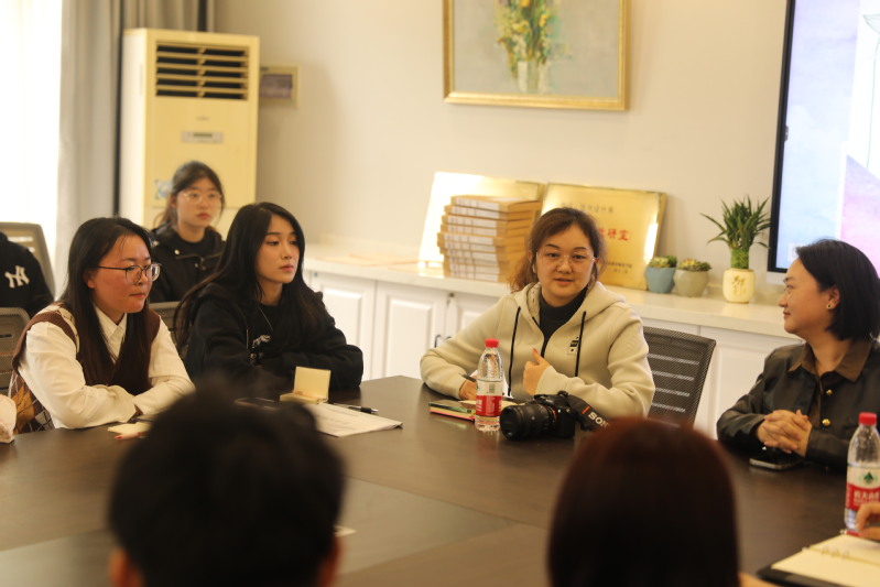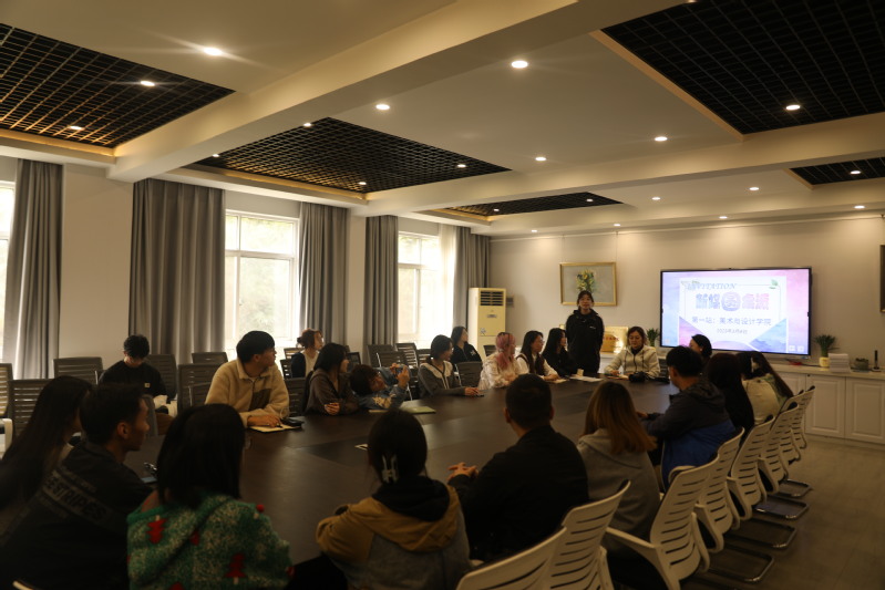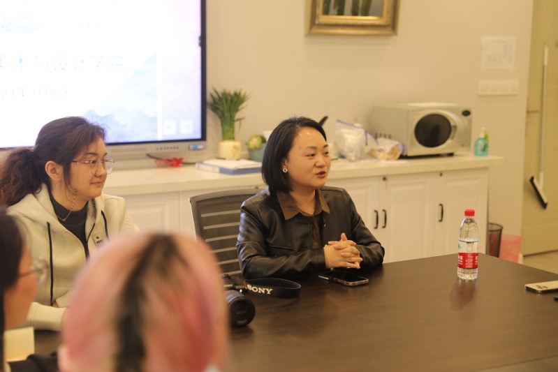 第一站,学校党委宣传部新媒体中心指导老师袁姝带领新媒体中心的学生骨干来到了美术与设计学院。活动开始前,美术与设计学院党总支副书记彭琳就活动目的和意义做出说明。袁姝老师以“校园媒体如何打造增长矩阵”为主题,从新媒体运营、传播策略、粉丝效应等多个方面,结合具体事例介绍了学校官微、官抖的发布作品类型和定位、人员架构和受众。随后,双方新媒体中心成员就新闻稿撰写、推文排版、视频剪辑等多方面展开了热烈讨论。
