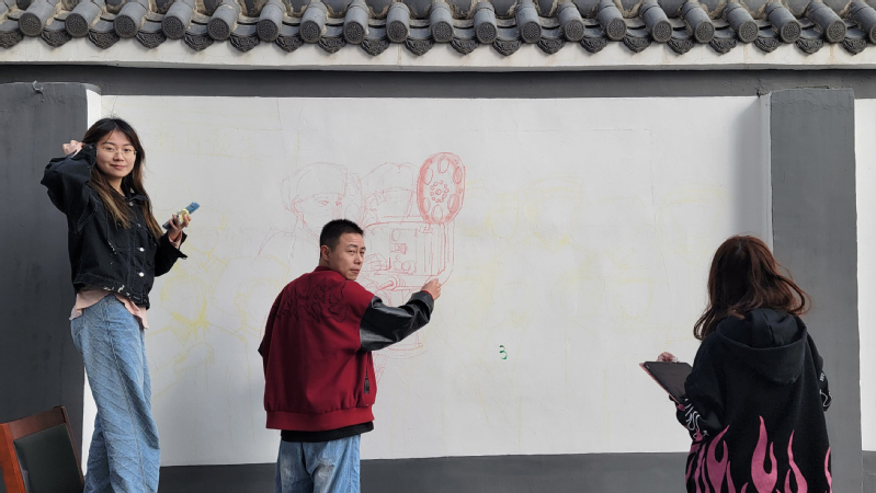 3月10号,黄一莉副院长与张潇老师带领同学们一起前往社区现场考察,协商讨论。南化社区党委书记戴增先接待师生一行,为团队讲述南化历史,提供创作思路。经过几番修改,志愿团队确定了墙绘主题,最终定下了大家满意的初稿。3月12日,志愿者们放弃周末的休息时间,早早来到社区,开始绘画。
