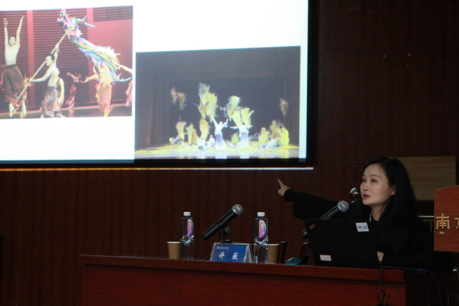 许薇教授以南京艺术学院舞蹈学院为例阐释了高等学校舞蹈教育与中华优秀传统文化之间的紧密联系,结合国内外文化交流经验,强调了作为当代大学生要树立文化自信和民族自信的必要性。许薇教授从表演艺术家戴爱莲的舞蹈艺术思想切入,从以采风为主的文化传承与实践、以创作为主的文化传承与实践、以传播为主的文化传承与实践、中国民族民间舞与文化背景以及如何更好树立高等学校舞蹈教育教学与创作的发展目标五个方面进行了深度阐释,并与现场观众分享了南京艺术学院舞蹈学院原创舞蹈作品《秋熟》《雨花石的等待》等多部获奖作品的创作过程。