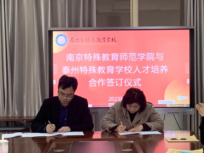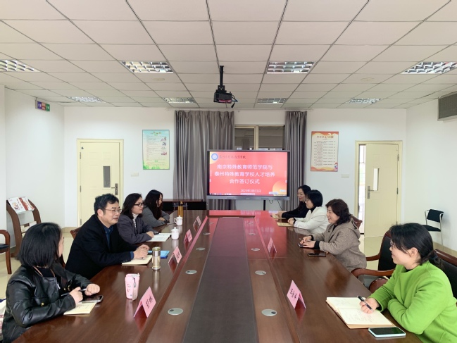 吴巧华校长代表泰州特殊教育学校对赵健院长一行来访表示热烈欢迎。她指出,南京特殊教育师范学院是培养特殊教育人才的主力军,期望以此次签订人才合作培养为契机,以美术与设计学院美育教育为支撑,创新应用型美术教育人才培养新模式,打造两校之间深度融合的基层特殊教育美术教育的新联合。赵健副院长对两校签约表示祝贺。他表示,今后两校要进一步加强在特殊儿童美术创新教育人才培养、课题研究、科学研究创新等方面的合作与交流,探索创新更多人才培养新模式。