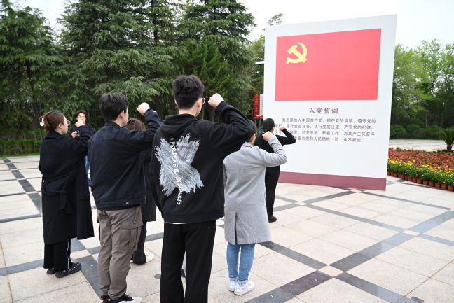 求雨山浦口革命烈士纪念碑广场庄严肃穆,在苍松翠柏掩映下,烈士纪念碑巍峨高耸,“革命烈士永垂不朽”八个大字熠熠生辉。全体师生在烈士纪念碑前整齐列队、静静肃立。在纪念碑下,张启昕书记带领现场全体党员面向鲜红的党旗,庄严重温了入党誓词。