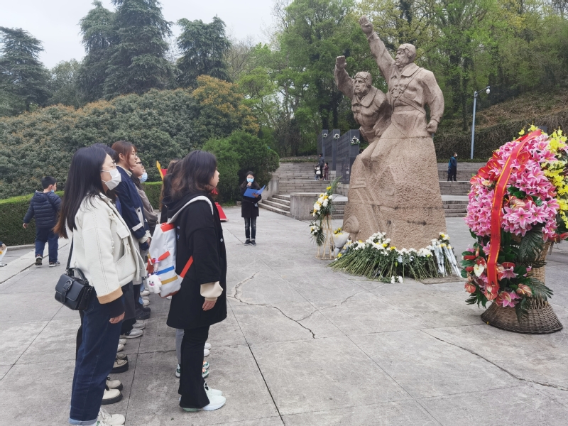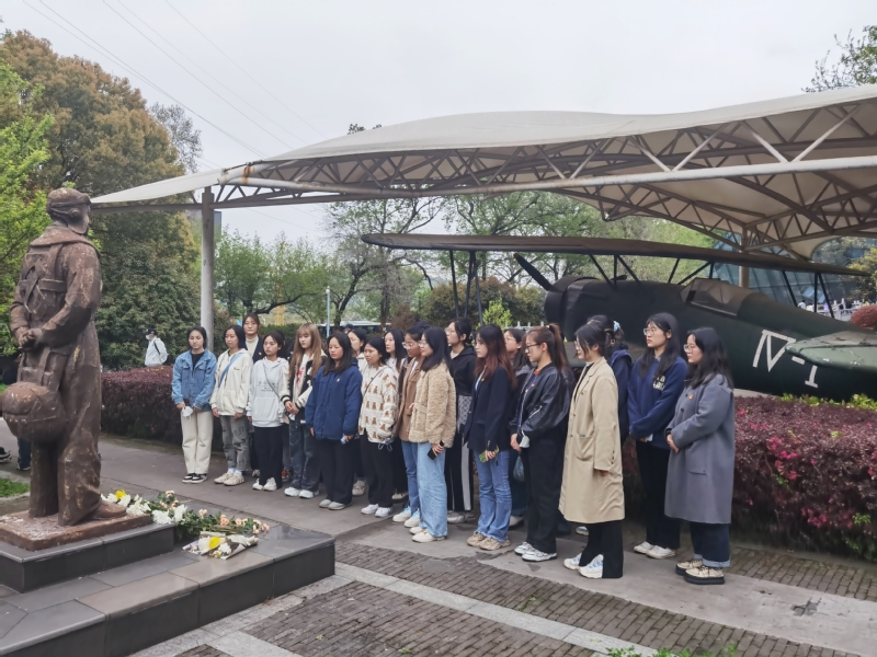 活动中,全体参观人员在抗日航空纪念碑前举行凭吊仪式。学生党员代表向纪念碑敬献花篮,全体人员向抗日航空烈士三鞠躬,缅怀抗日航空先烈。