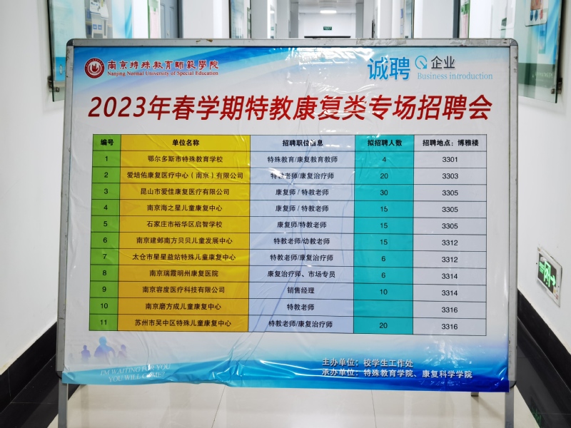 4月9日上午,2023年春学期特教康复类专场招聘会成功举办,此次招聘会由校学生工作处主办,特殊教育学院、康复科学学院联合承办。鄂尔多斯市特殊教育学校、石家庄市裕华区启智学校、南京瑞霞明州康复医院、苏州市吴中区特殊儿童康复中心、南方贝贝儿童发展中心等11家用人单位来到现场招聘,面向我校特殊教育、康复治疗学、教育康复学等专业应届毕业生,共提供140多个工作岗位。校学生工作处和特殊教育学院、康复科学学院相关领导、毕业班辅导员来到招聘会现场,与用人单位开展深入交流,也鼓励毕业生明确就业目标,增强就业意识,早日找到理想的工作。