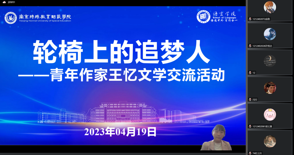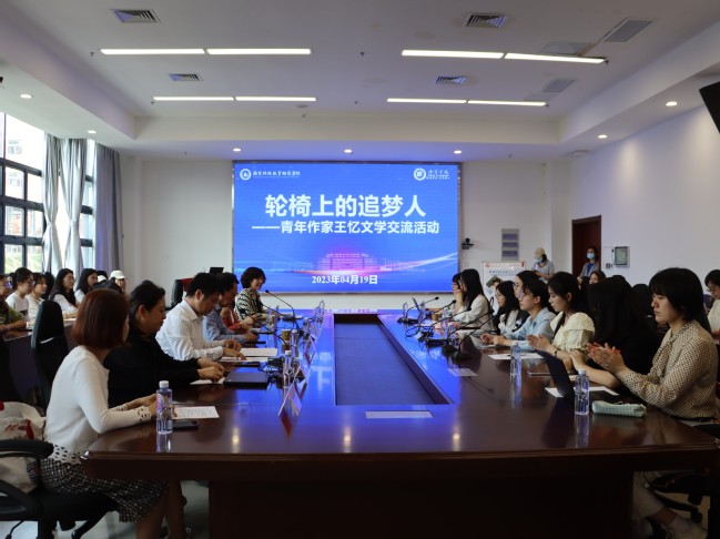 为激发学生奋发有为、积极向上的精神和克服困难、战胜挫折的勇气,4月19日下午,语言学院邀请到全国三八红旗手、中国残疾人事业十大新闻人物之一、南京市自强模范——青年作家王忆开展文学交流活动。此次活动由中文系赵惠岩教授主持,语言学院执行院长王东教授出席。中文系全体教师及汉语言文学专业2021级学生代表参加活动。