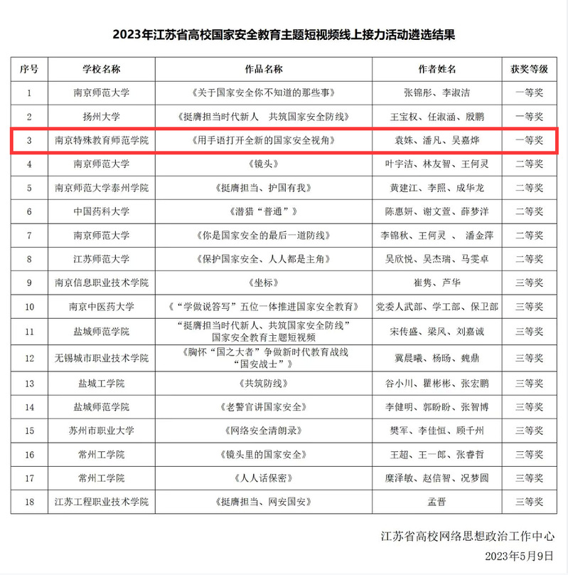 为深入贯彻落实总体国家安全观,充分展示高校国家安全宣传教育成果,在省高校网络思想政治工作中心的号召下,我校积极参加由教育部思想政治工作司指导,中国大学生在线、腾讯共同主办的国家安全教育主题短视频线上接力活动。其中,选送的短视频作品《用手语打开全新的国家安全视角》荣获一等奖。