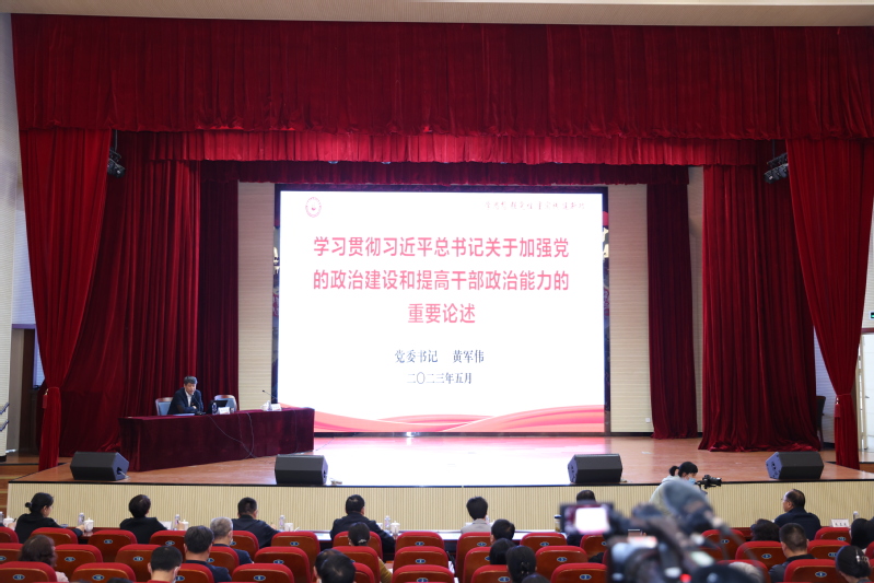 5月10日下午,党委书记黄军伟以《学习贯彻习近平总书记关于加强党的政治建设和提高干部政治能力的重要论述》为题讲授学习贯彻习近平新时代中国特色社会主义思想主题教育专题党课。全体中层及以上干部齐聚实验实训大楼报告厅聆听专题党课。省委主题教育第十六巡回指导组成员、省委组织部组织三处(省委“两新”工委办公室)二级调研员黄颂到场指导。党课由党委常委、副校长陈克军主持。