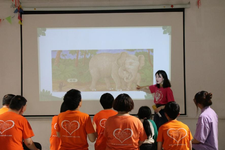 在阅读环节中,疗愈小组以PPT插画展示为基础,结合常识普及、看图说话、表情演绎、动作模仿等形式,为疗愈对象带来生动的文学体验。在活动现场,心智障碍伙伴们全心投入、神情专注,积极与主持人互动,当与故事情节产生共情时,还会自主地与周围的伙伴讨论。