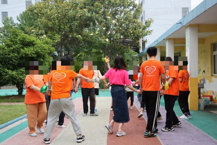 随后的游戏环节,是将绘本表现的爱、温暖与归属感,通过游戏实现具象化。疗愈小组有序组织心智障碍伙伴,尝试两人、三人合作,根据音乐节奏和主持人口令,迅速寻找特定的拥抱对象,并完成肢体动作抱抱。这既能够锻炼参与者的反应能力,同时使他们感受温暖的拥抱、体验到归属感,以获得更佳的疗愈效果。