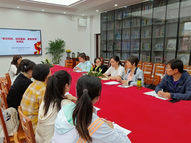 为扎实深入开展学习贯彻习近平新时代中国特色社会主义思想主题教育,5月24日下午,教育科学学院教师第一党支部,组织全体党员教师围绕“牢记嘱托、感恩奋进、走进前列”主题,开展大讨论活动,党支部书记李会敏主持,全体党员教师参加讨论。