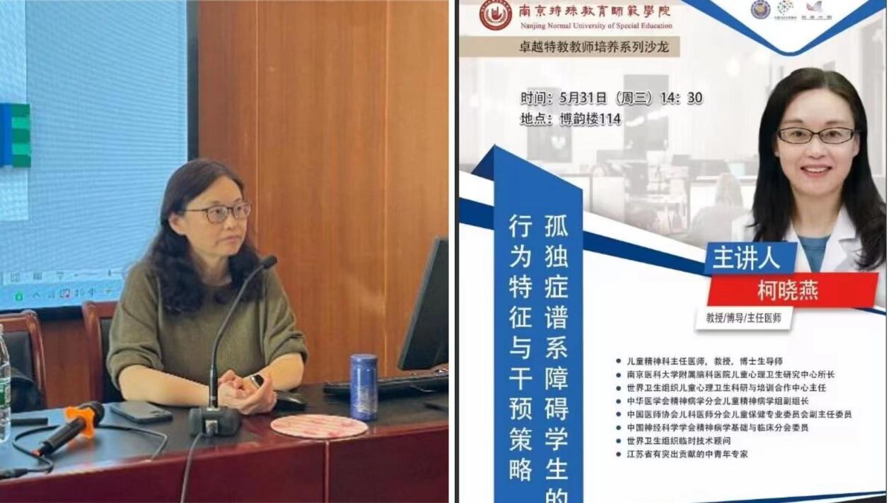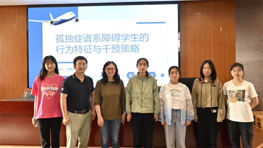 2023年5月31日是第七个全国科技者工作日。为了增进特殊教育专业师范生对孤独症儿童诊疗的了解,增强未来特殊教育教师专业团队合作能力,提高在校学生的专业素养和学术视野,特殊教育学院特邀全国知名专家、南京市脑科医院儿童精神科主任、主任医师、博士生导师柯晓燕教授在博韵楼114报告厅开展“孤独症谱系障碍学生的行为特征与干预策略”知识科普讲座暨卓越教师培养主题沙龙。学院院长李拉与柯晓燕主任亲切会面,学院副院长张伟锋和2021孤独症一班、二班、2021培智二班、2021级卓越班同学参加活动,2021级卓越班付强同学主持。