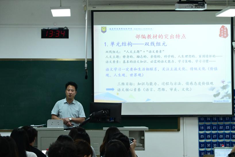 迈皋桥初级中学王行升老师开展了主题为教师必备能力的主题讲座。他从部编版教材的突出特点、教学设计前“备”什么、当下语文一些重要的教学理念、从教资面试看模拟授课以及初中教师如何说课等方面进行了详细讲授,现场反响热烈。