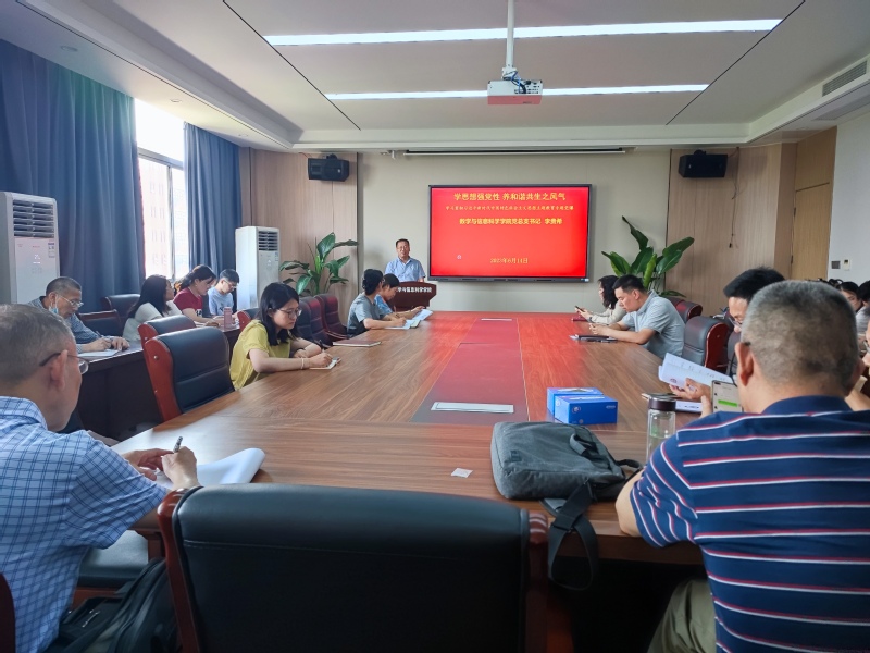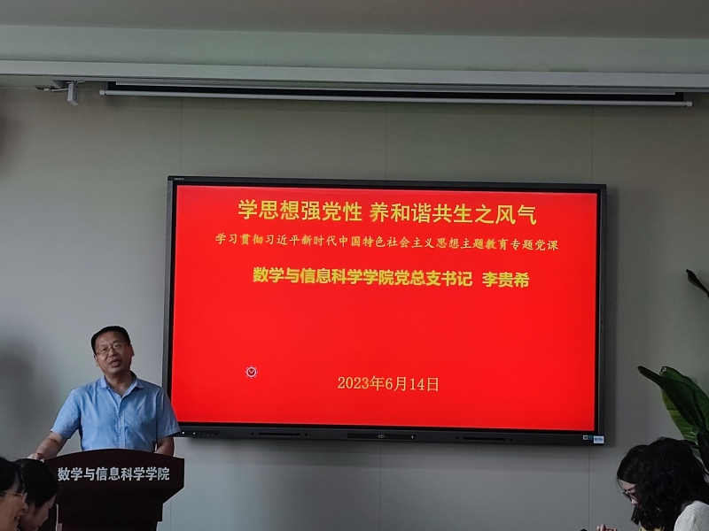 6月14日下午,在博雅楼3601会议室,数学与信息科学学院党总支书记李贵希以《学思想强党性 养和谐共生之风气》为题,讲授学习贯彻习近平新时代中国特色社会主义思想主题教育专题党课。数学与信息科学学院全体师生党员集中聆听党课。党课由学院党总支副书记丁雯主持。