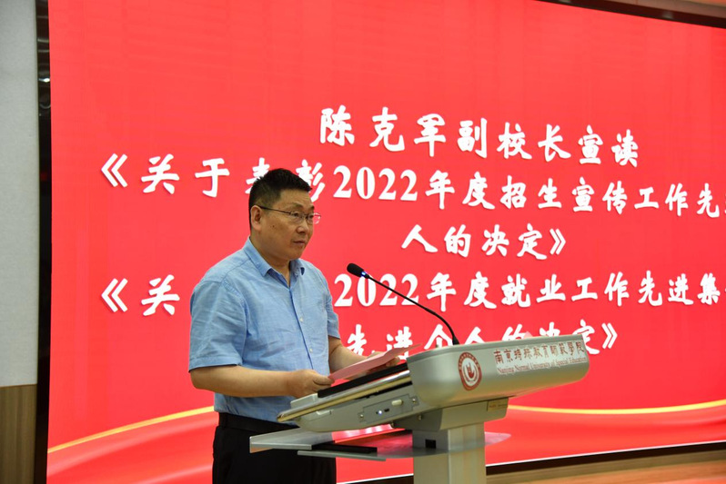 学生工作处负责人对2022年招生就业工作作了总结介绍。党委常委、副校长陈克军宣读了《关于表彰2022年度招生宣传工作先进个人的决定》《关于表彰2022年度就业工作先进集体和先进个人的决定》,党委副书记、校长王立新为获奖的个人和集体代表颁奖,党委书记黄军伟作动员讲话。