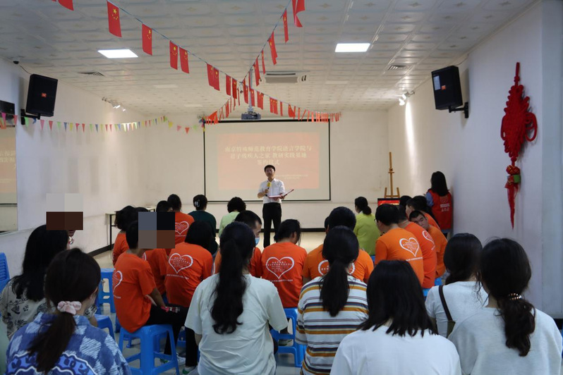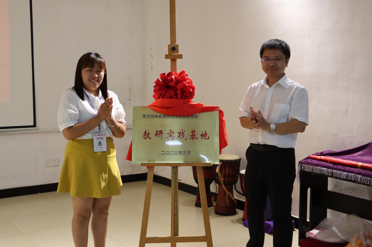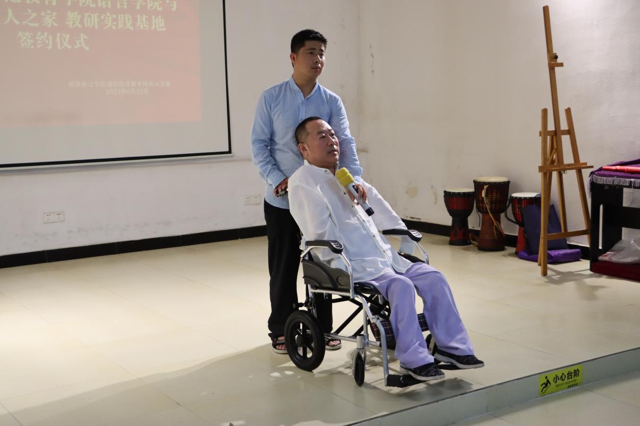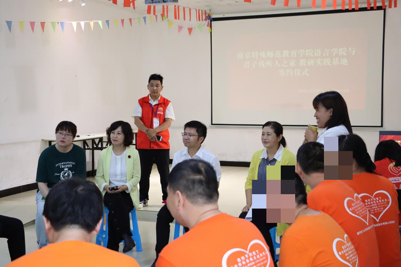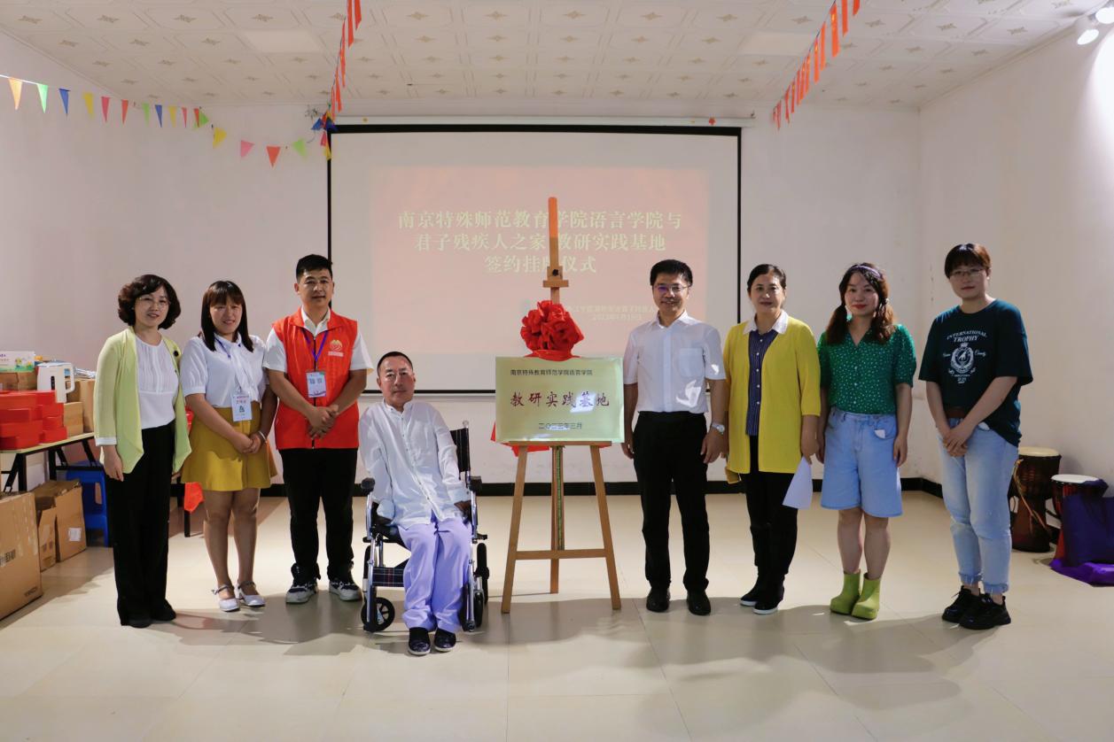 六月唯夏,山有嘉卉。近日,为坚持落实立德树人根本任务,传递“博爱塑魂”校训精神,践行服务残疾人事业和特殊教育的使命,我校语言学院中文系赴南京市江宁区湖熟街道君子残疾人之家,举行教研实践基地挂牌仪式。君子残疾人之家创办人君子老师、语言学院王东院长、中文系康盛楠主任、赵惠岩教授、施依秀博士、葛天逸博士,以及文学阅读疗愈小组的同学们、君子残疾人之家的志工老师和学员们共同参加了活动。