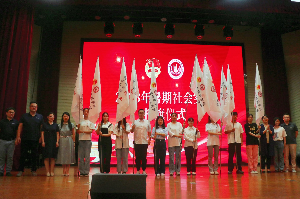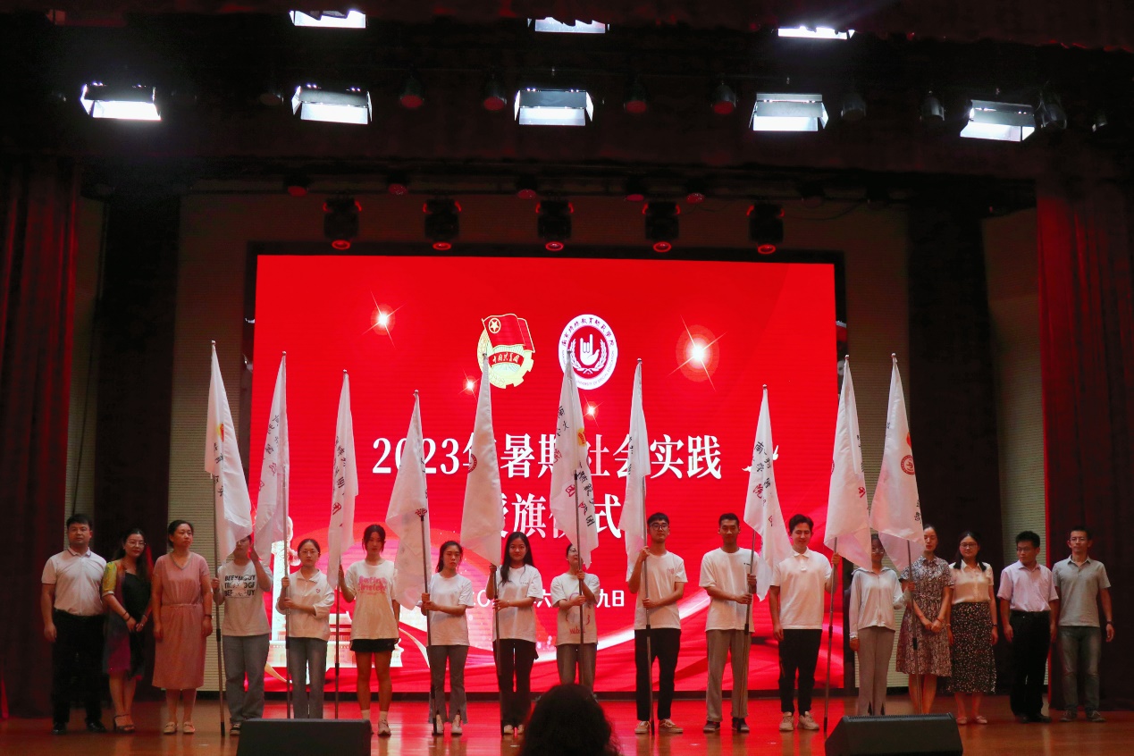 校党委副书记谭忠为实践团队授总旗,各有关职能部门、二级学院负责人分别为校级团队、院级团队代表授旗。