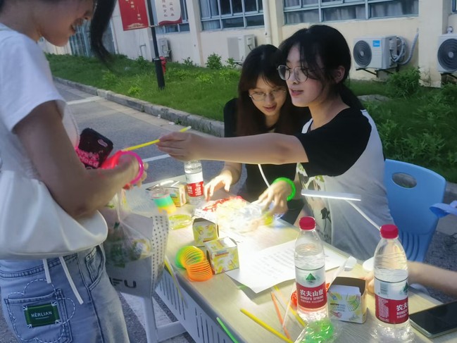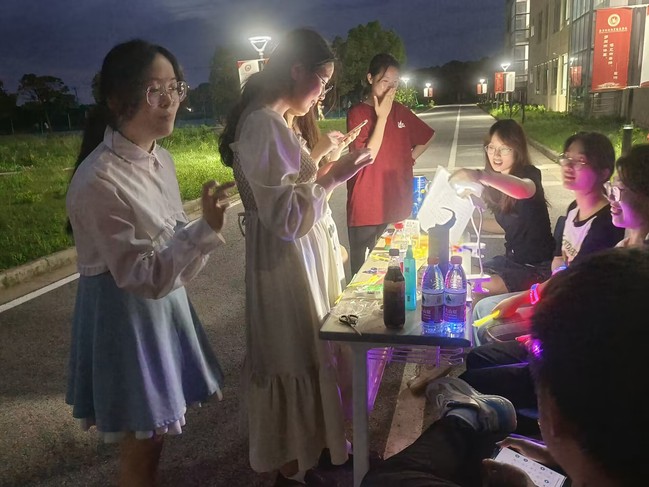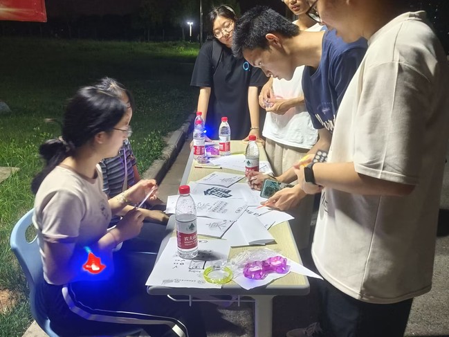本次荧光夜活动主要采用趣味游戏形式,在同学们日常生活必经之地设游戏点,小花园、综合楼、食堂、宿舍等都在其中。游戏内容结合学院专业特点,以英语单词、中文汉字为题目来源设计字谜游戏、单词拼写游戏等,采用团队打卡积分的方式,在玩中学、在学中思。同学们积极参与,聚在一起有说有笑,讨论着答案。不久,就有同学过五关、斩六将,完成了游戏闯关。同学们利用手中的积分卡兑换礼品,荧光棒、悠悠球、荧光手环等小物件绽放出点点荧光,在漆黑的夜晚照亮了江宁校区。活动结束后,大家满载而归。