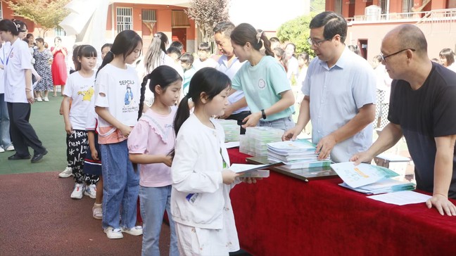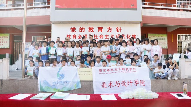 各位领导老师为夏令营学员们发放雨露美育学具包。雨露美育学具包是在南京阳光心汇心公益基金会的支持下,由南京特殊教育师范学院美术与设计学院雨露志愿团队的志愿者们在团队建设、磨课练习之余,利用专业技能,通过专业社会实践、社会服务和社会资助等方式自行筹资购买,学具包中包含水彩笔、绘画本、勾线笔、绘画颜料、美术档案袋等系列学习用品。