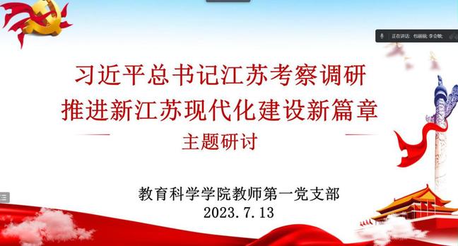 7月13日,教育科学学院教师党支部的同志们相聚云端,围绕习近平总书记江苏考察调研之行展开主题研讨,分享交流收获与感悟,并进行暑期调研工作的部署。会议由教师第一党支部书记李会敏主持,教师党支部的全体教师党员参加。