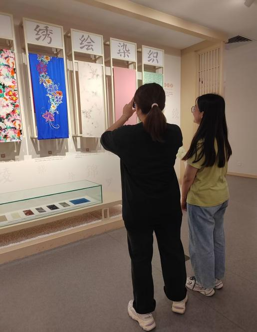 在讲解员的专业讲解下,队员们深入领会了“织”“染”“绘”“印”“绣”五大制作技法,并能对服饰的制作方法做出简单判断。通过对纺织机原型的细致观察与研究,大家直观地了解到纺织的操作方法与具体流程,不禁赞叹古人的智慧与创造。大家流连于珍贵的织绣藏品,结合简洁明了的文字介绍,观览了“南都繁会”的织造历史,熟悉了三大锦、四大绣,为传承非物质文化遗产奠定了知识基础。