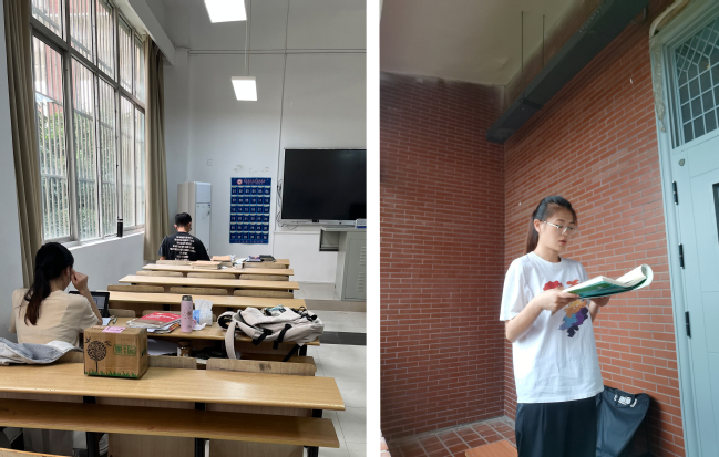 留校同学的学习热情亦如这炎热的盛夏。灯光明亮的教室内,留校考研的学生们聚精会神地学习,他们有的在认真刷题,有的在收看讲座,有的在自习室外背单词,体现了当代大学生积极向上、朝气蓬勃的精神面貌。