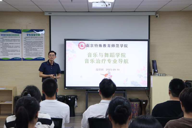 音乐治疗系主任段冀州与新生班主任张敏讷,带领同学们参观实验实训大楼音乐治疗室。段冀州主任就本专业的师资力量、专业建设情况、课程结构、培养目标进行介绍与讲解,并对大家的问题进行了耐心解答。段冀州主任希望同学们要有奉献精神、热爱音乐治疗,熟悉音乐治疗基础且能掌握音乐治疗各流派。