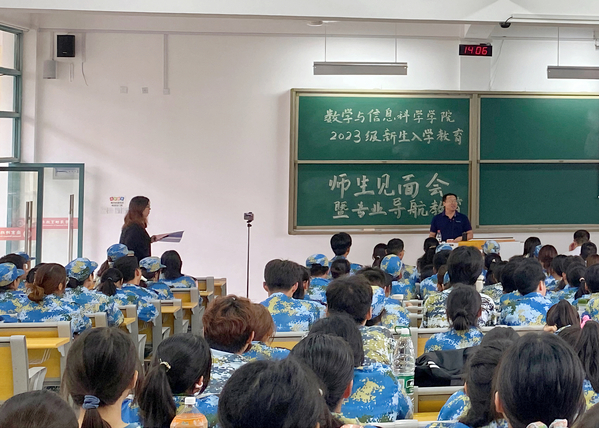 9月20日,数学与信息科学学院召开2023级师生见面会暨专业导航教育活动。学院党总支书记李贵希、院长王兵、党总支副书记丁雯、副院长陈仲珊、副院长孙计领、教育技术学系主任刘艳菊、计算机科学与技术系主任蒋贤维、数据科学与大数据技术系主任杨君、数学与应用数学系教师王翔宇,2023级新生辅导员李昀熹、朱思橙以及2023级全体新生参加本次会议。会议由2023级新生辅导员朱思橙主持。