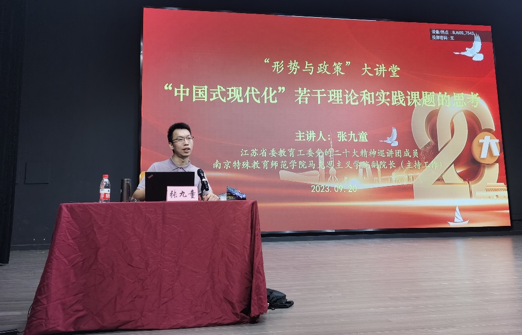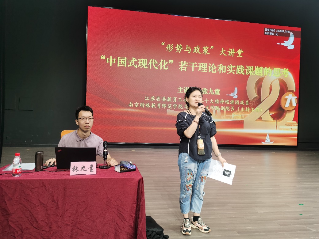 讲座中,张九童副院长(主持工作)围绕“近代中国追求现代化进程中的矛盾透视”“马克思主义的‘两个结合’:中国式现代化的求解方法”“中国式现代化的中国特色及其在残疾人事业中的实践叙事”“中国式现代化的本质要求及其价值超越”“中国式现代化对人类现代化发展规律的探索”等方面引导学生们深刻理解中国式现代化内涵和意义,认知中国式现代化如何创造人类文明新形态,同时体会中国式现代化与残疾人事业发展间的关系。