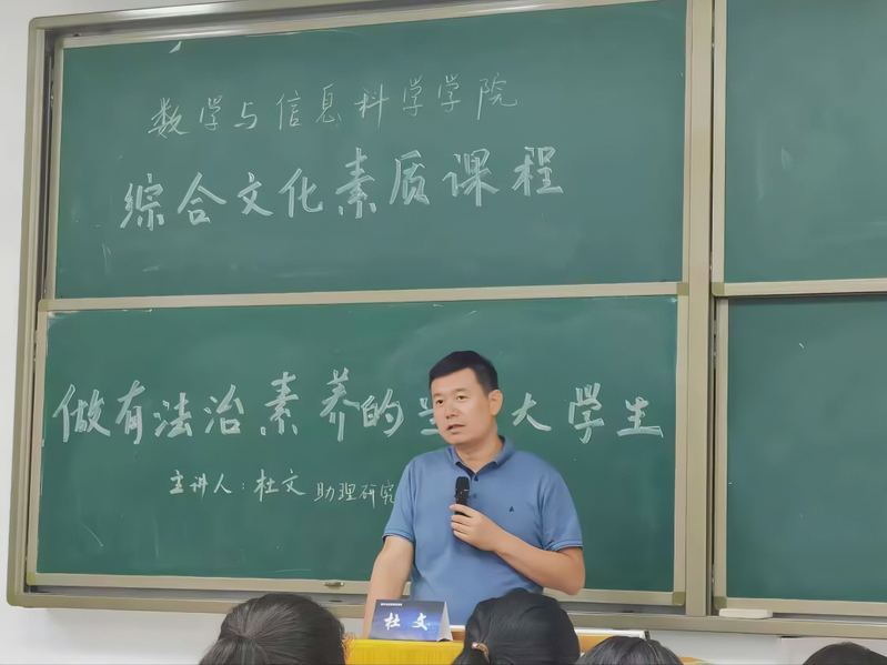 法者,天下之程式也,万世之仪表也。为帮助江宁校区大一新生增强法治观念,筑牢法治意识,培塑法治思维,近日,数学与信息科学学院在江宁校区面向2023级新生开展了《做有法治素养的当代大学生》综合文化素质讲座。讲座由数学与信息科学学院教学科研办公室杜文老师主讲,2023级新生辅导员朱思橙主持。