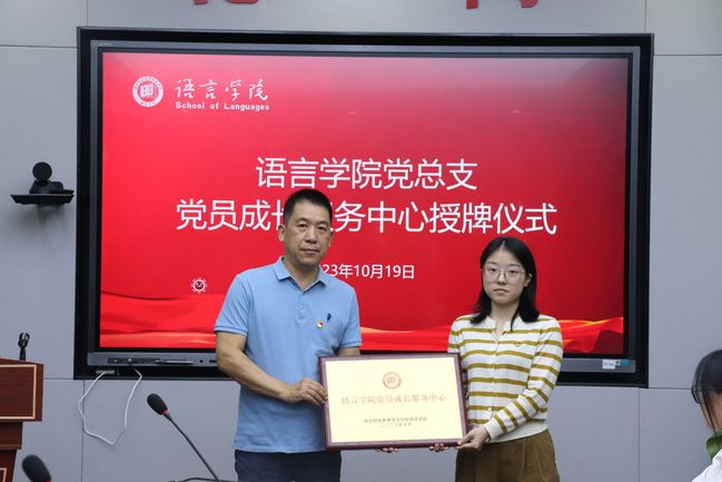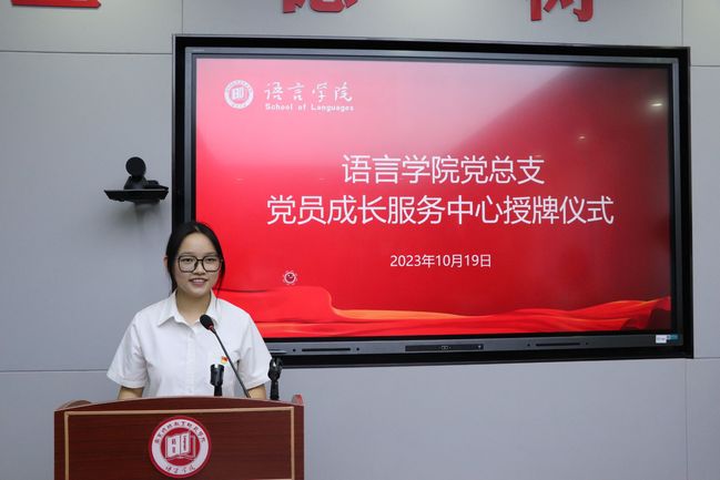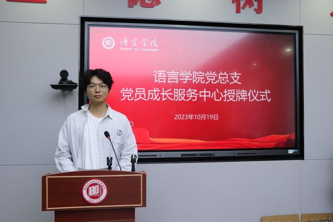 2023年10月19日下午,在校党委组织部的指导下,语言学院党总支举行党员成长服务中心授牌仪式。语言学院党总支书记丁祖保、党总支副书记张冬冬、教学副院长刘海军、学生第二党支部书记翟玉杨,教师第一党支部入党积极分子努尔亚及部分入党积极分子学生代表参加本次授牌仪式。授牌仪式由语言学院党总支组织委员、学生第一党支部书记杨菊鑫主持。