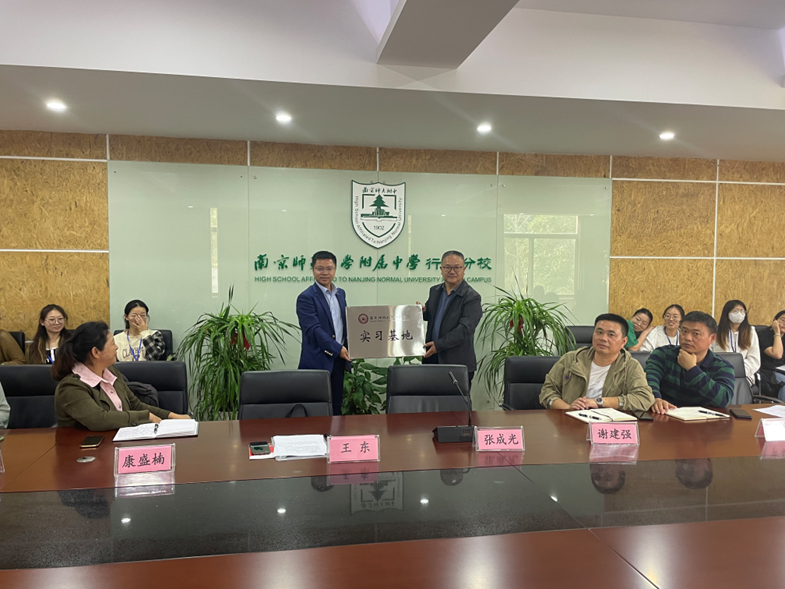 日前,语言学院2107班41名学生赴南京师范大学附属中学开展实习活动。语言学院执行院长王东、中文系系主任康盛楠、学院老师刘卿与南京师范大学附属中学行知分校张成光校长、谢建强副校长、卢朱牧副校长及德育处主任陈莉等进行了深入的交流,签订实习基地协议并举行授牌仪式。