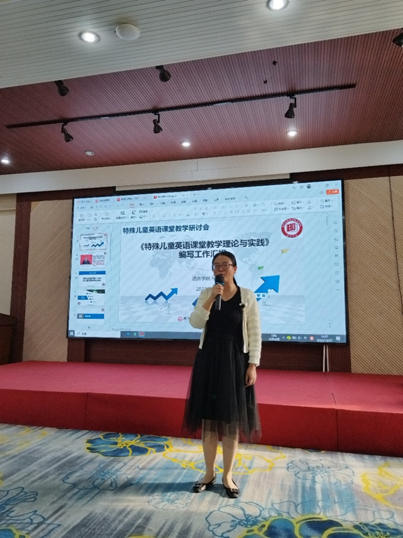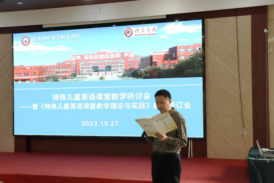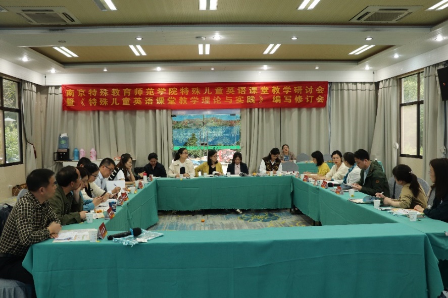 为了更好更快地编写出版《特殊儿童英语课堂教学理论与实践》教材,同时研讨特殊儿童英语课堂教学,加强英语一流本科专业建设,10月27日,语言学院全体教材编写人员以及来自南京师范大学、南京市聋人学校、南京市盲人学校、南京市中电颐和家园小学和南京大学出版社的专家们在南京市八卦洲会议中心交流研讨特殊儿童英语课堂教学,听取各方意见,修订完善教材。会议由语言学院副院长刘海军主持。