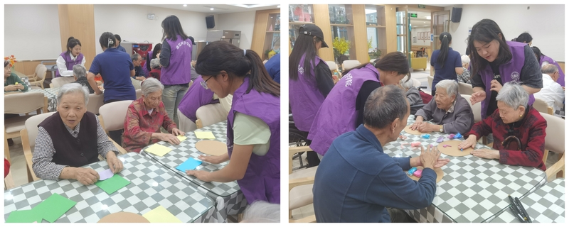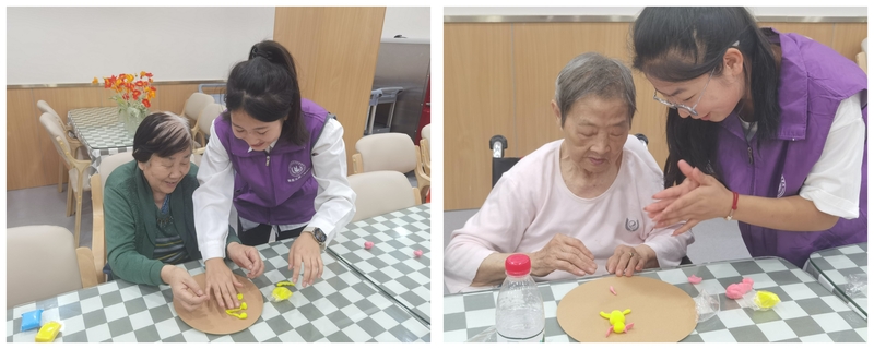 活动中,志愿者们为老人们表演诗歌朗诵,带领老人们开展折纸与黏土画制作等活动。“奶奶,您这花做的特别漂亮!”“奶奶,您折的太好了,给您点赞!”在志愿者的带领下,老人们充分发挥想象力进行手工DIY,完成了一件件生动有趣的作品。“爷爷,您捏的是家里养的小鸡吧?”“是的啊,年轻的时候家里养了不少。像不像?”李爷爷得意地说。“像,真像!”大家纷纷应和道。温馨欢快的气氛晕染了整个活动室,看到老人们灿烂的笑容,听到老人们爽朗的笑声,志愿者们也充分体会到了本次活动的意义所在。