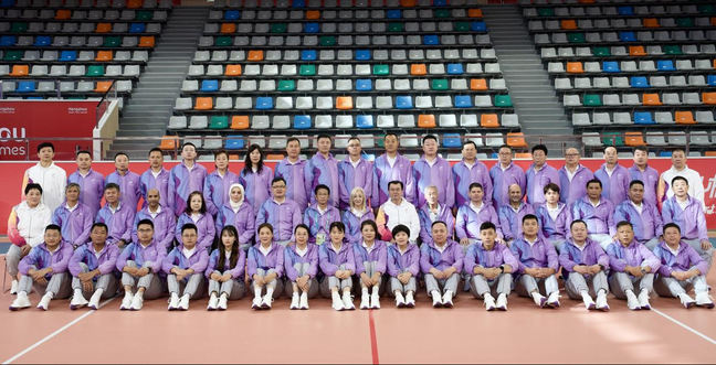金梅(前排中)担任第四届亚残运会盲人门球比赛国内技术官员