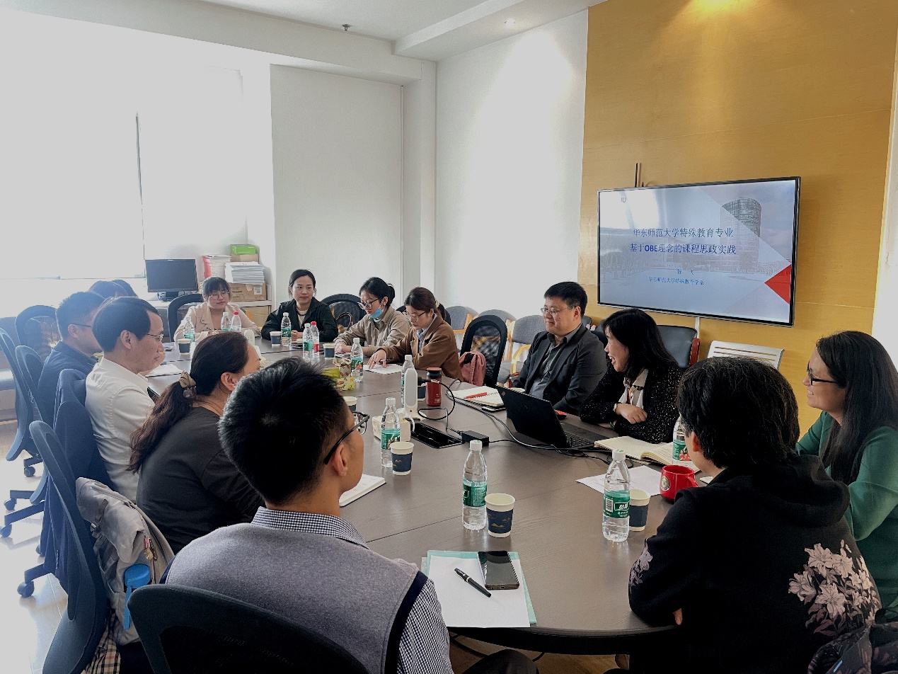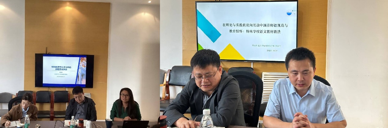 听课后,教师组和特殊教育系领导、老师进行专题学习交流。系主任昝飞教授从背景、工作路径、主要完成的任务、课程实施四个方面介绍了该系基于OBE理念的课程思政实践,陈莲俊书记从课程定位、教学目标、课程内容安排、教学环节、教学评价五个方面对特殊教育专业见实习中的课程思政实践进行了交流,黄志军副教授结合《特殊学校语文教材教法》的课程思政探索,从整体规划、实施策略、实施成效、建设反思四个方面进行了分享。双方还就本科人才培养方案修订、师范类专业认证、实习安排和管理、考研支持等重要问题展开充分的讨论和交流。现场气氛热烈,畅所欲言,同学们普遍感到启发收获很大。