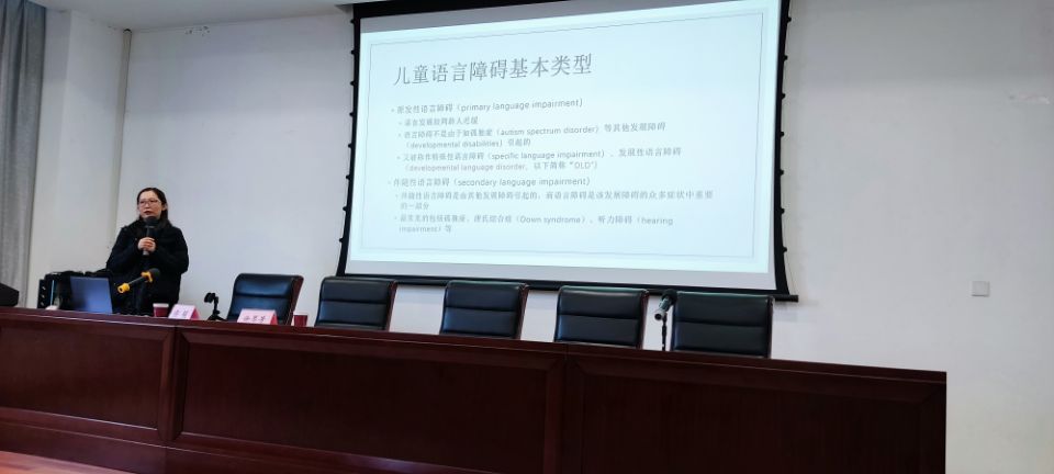 盛欐教授以《汉语发展性语言障碍的识别标准》为题,介绍了儿童语言发展规律以及障碍类型,对发展性语言障碍进行了详细阐述。后又结合汉语发展性语言障碍的评估工具以及诊断标准等研究情况,展示了其团队研发的普通话句子重复任务(MSRT)和普通话口语词汇筛查工具(MOVS),对以上工具的信度、效度和应用前景等进行了介绍。