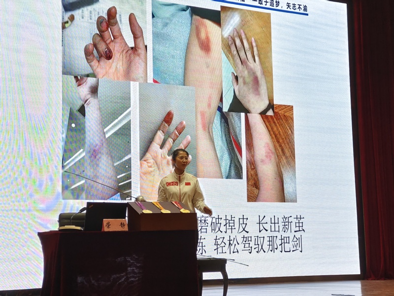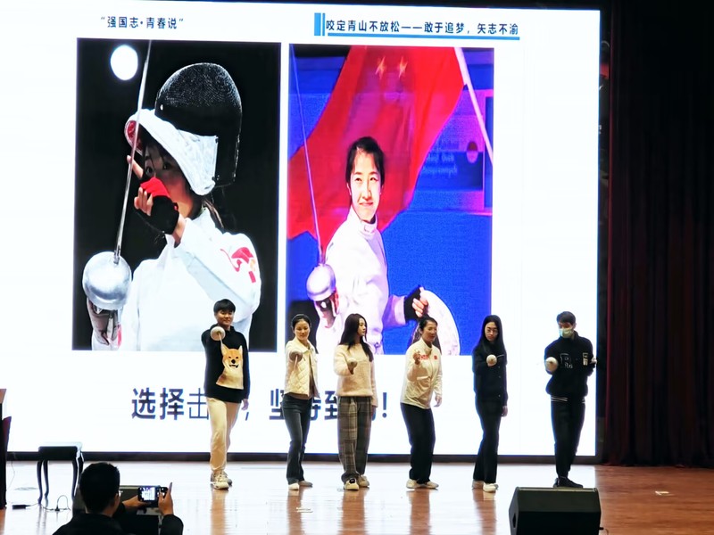荣静与同学们分享了她参加三届奥运会的心路历程,讲述了如何潜心修炼战胜自己、砥砺前行的精彩人生。讲座过程中,荣静为在场的老师和同学们展示讲解了不同种类的击剑,并教授大家基础的击剑动作,还给大家展示了她所获得的部分奥运金牌,让同学们近距离接触到了每一位体育人梦寐以求的奥运奖牌。