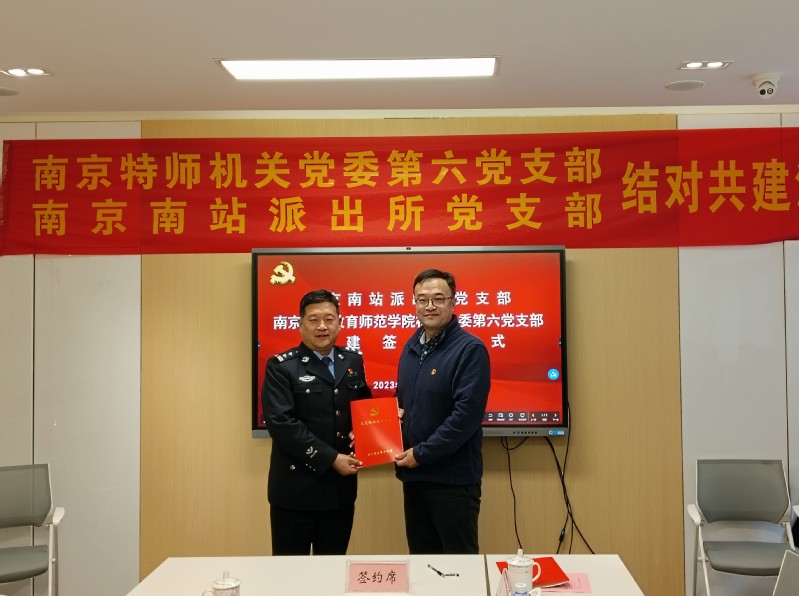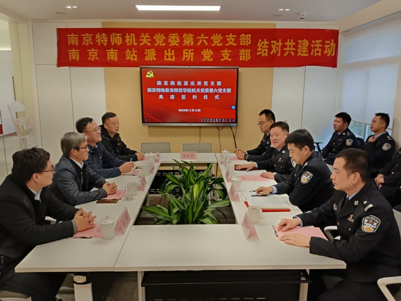 11月16日下午,南京铁路公安处南京南站派出所所长侍亚洲、政委孔文俊一行来到我校栖霞校区,与机关党委第六党支部开展结对共建活动。结对活动开始前,校党委书记黄军伟会见了南京南站派出所班子成员。校党委副书记谭忠,党委常委、党委统战部部长、学工部部长高飞及双方支部成员参加了本次活动。