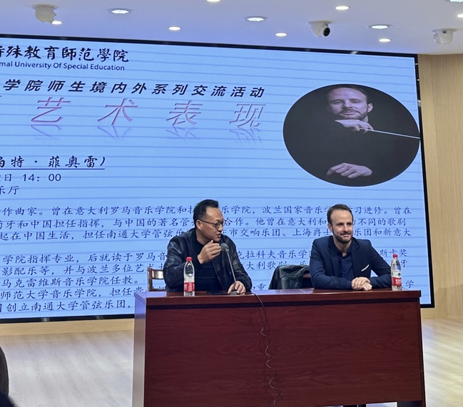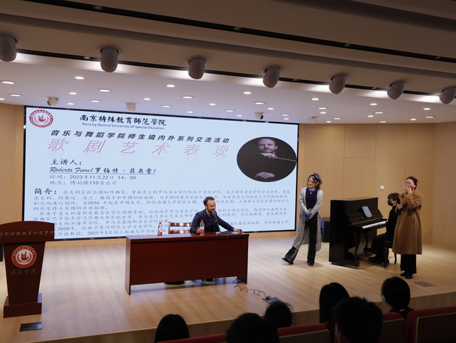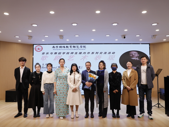 为加强对外国际交流与合作,给师生们提供一个展现自我、提升专业水平的平台,音乐与舞蹈学院近日邀请意大利管弦乐团团长及作曲家罗伯特·菲奥雷教授来校,就歌剧艺术表现与学院师生进行交流。音乐与舞蹈学院党政班子、音乐治疗系主任段冀洲、声乐教研室负责人孙莹、团总支书记邓露及其他教师、学生等参加活动。