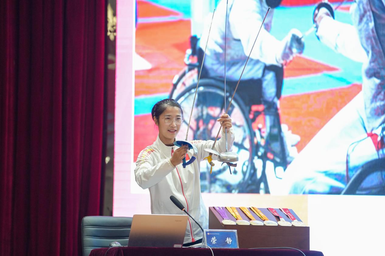 三届残奥会金牌获得者、轮椅击剑世界冠军、中国青年五四奖章获得者和全国三八红旗手荣静以“为梦想而战”为主题,与在场师生分享了她励志而精彩的人生经历。