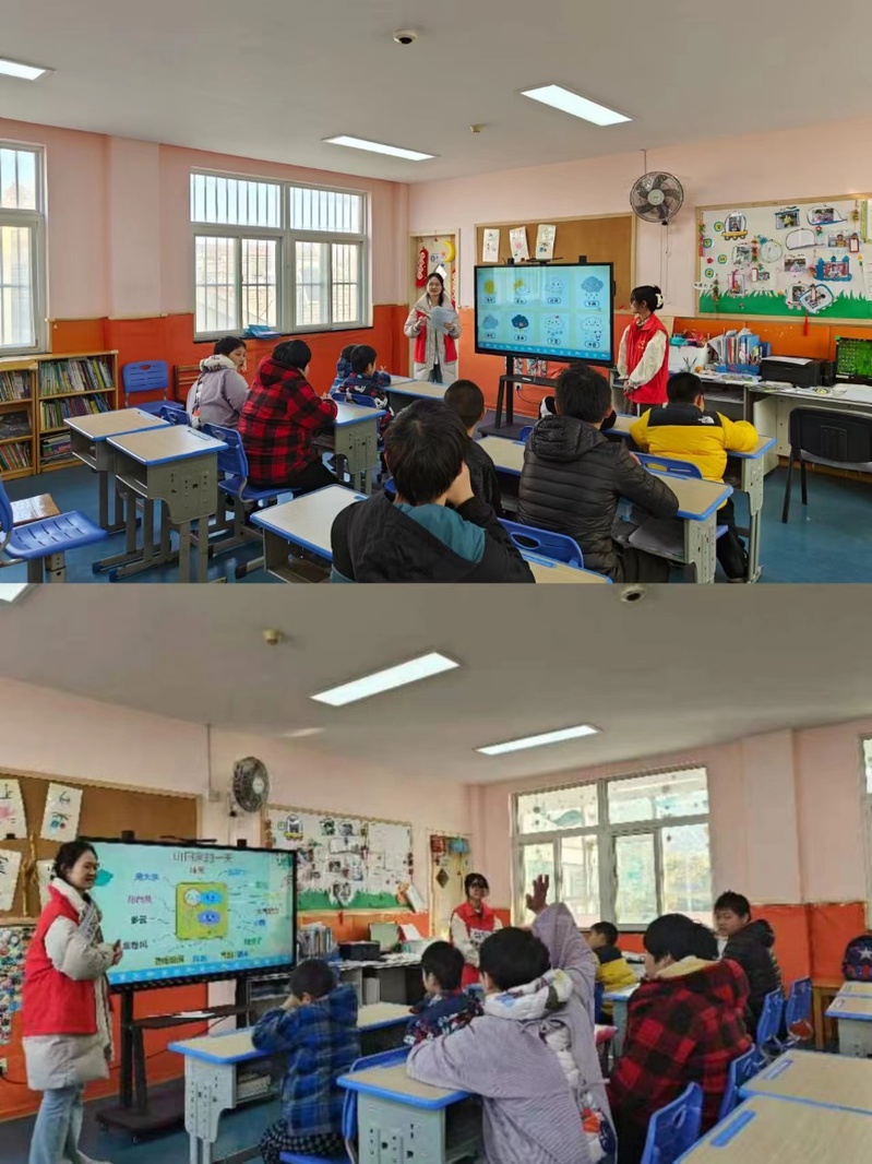 活动现场,王盈老师根据20多名小朋友的年龄及认知水平分为小、中、大三个小组,每组配备两名大学生志愿者,分别在三个教室开展阅读活动。通过生动形象地讲述绘本故事《山田家的气象报告》,老师和志愿者帮助不同年龄组实现不同的目标。