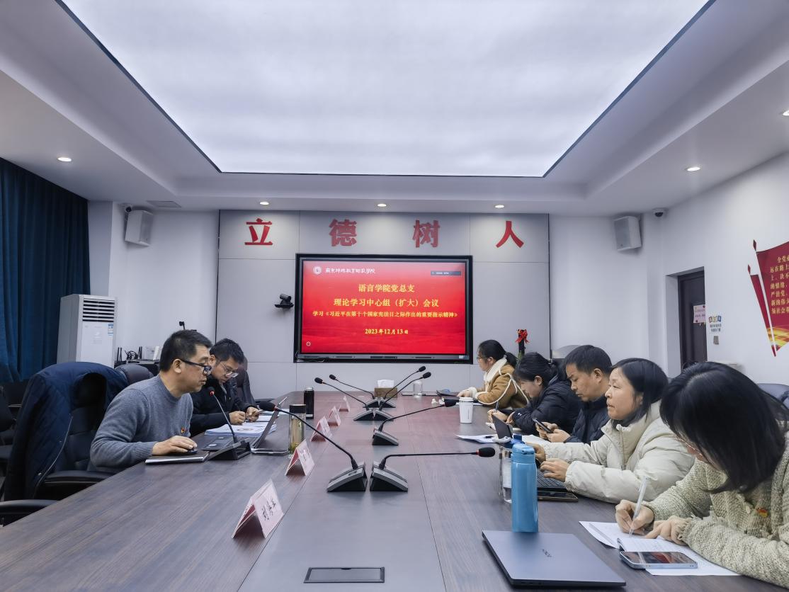 12月13日下午,语言学院党总支理论学习中心组(扩大)召开学习会,专题学习习近平总书记在第十个国家宪法日之际作出的重要指示精神,会议由学院党总支书记丁祖保主持,党总支副书记张冬冬领学。语言学院理论学习中心组成员及各党支部书记参加会议。