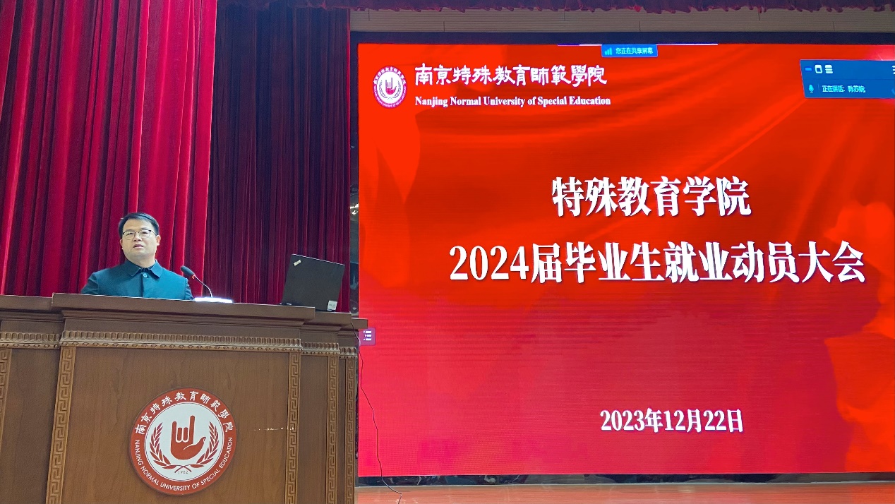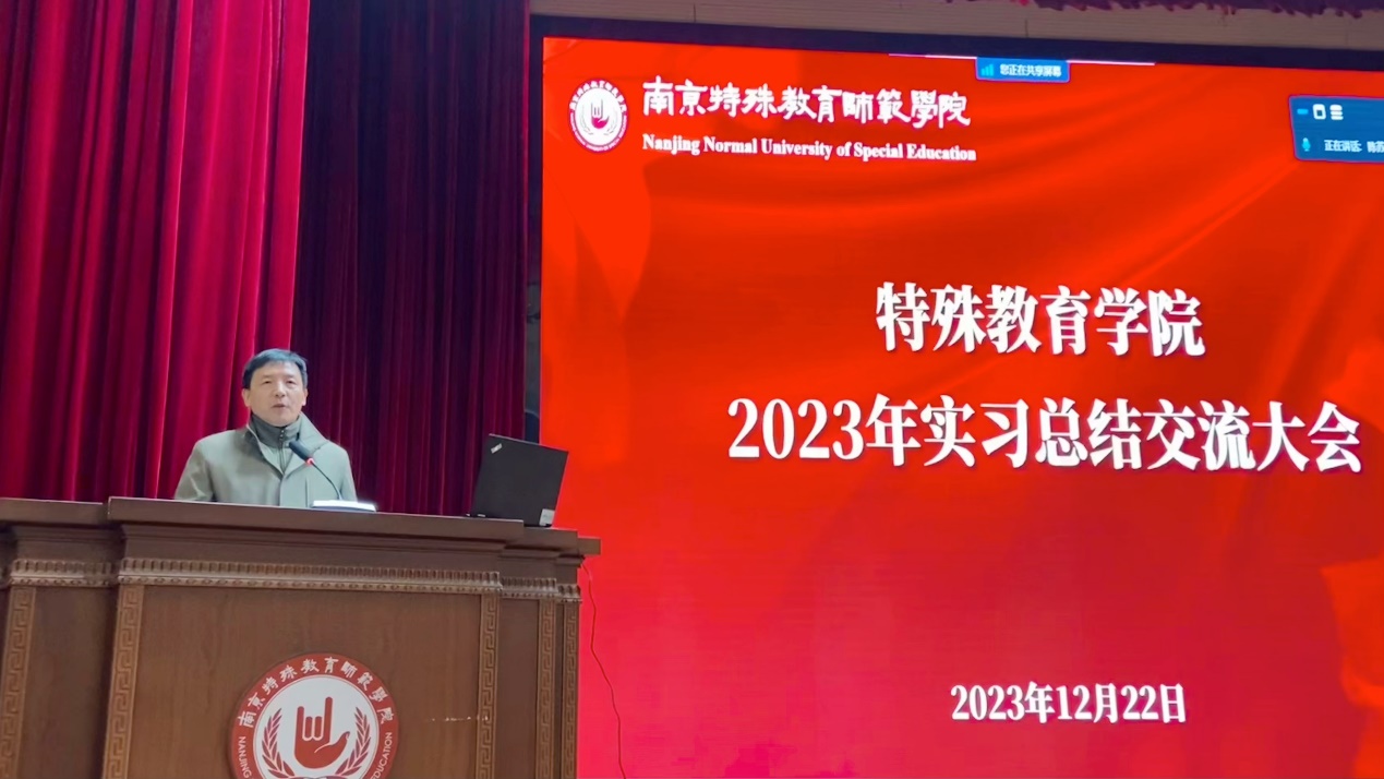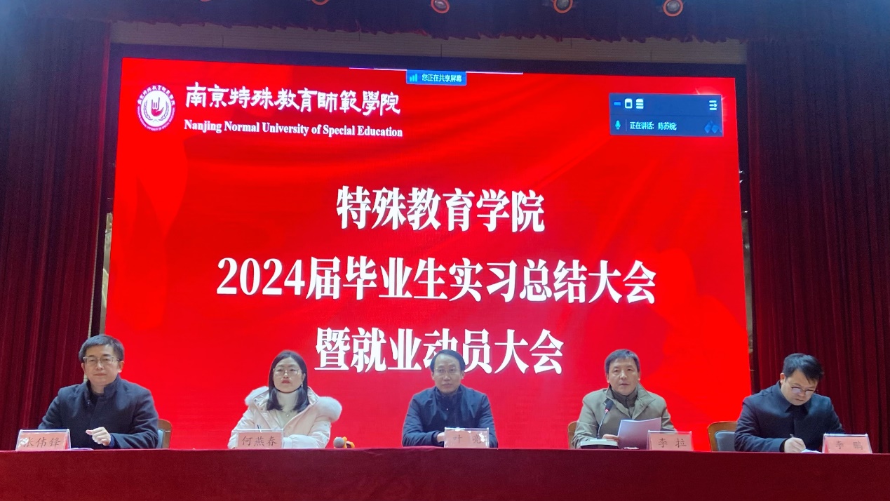 2023年12月22日上午,特殊教育学院举办2024届毕业生实习总结大会暨就业动员大会。特殊教育学院党总支书记叶亮、院长李拉、副书记李鹏、副院长张伟锋、教务处实践科科长何燕春参加活动,会议由李拉院长主持。特殊教育学院2020级全体实习生和2021级、2022级部分学生代表参加活动。