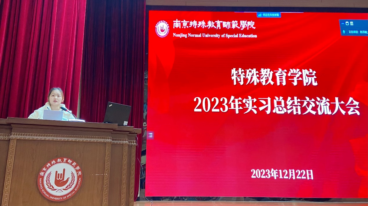 2020级优秀实习生代表特殊教育专业陈皖荷同学、应用心理学专业宋雨晴同学和手语翻译专业陈静怡同学,分别分享了本次实习的收获,也向学弟学妹们介绍了三个专业今年实习的总体情况,鼓励学弟学妹们端正学习态度,积极参加实践活动,学习如何把理论知识应用于实践,及时查漏补缺,做好个人规划。