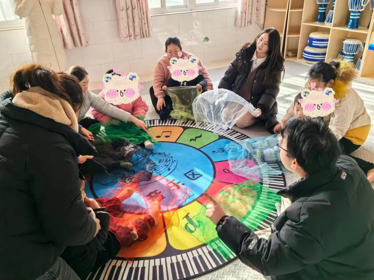 两位同学针对节奏、音乐律动、乐器演奏几个方面,带康复部各位老师和学生理解与体验了部分音乐治疗活动,如“一二三木头人”“纱巾游戏”等音乐活动。以玩乐的形式进行课程教学,在玩中学,在学中玩。