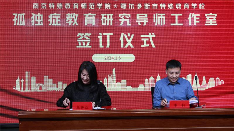 鄂尔多斯市特殊教育学校还聘任李拉院长和孤独症教育研究中心团队在鄂尔多斯建立孤独症教育研究导师工作室。未来工作室将围绕孤独症教育课程建设、指导鄂尔多斯特校教师专业发展、开展孤独症教育专题培训、进行合作研究等方面开展工作。这也是我校孤独症儿童教育本科专业开办后,在国内签署的第一家孤独症教育合作单位。