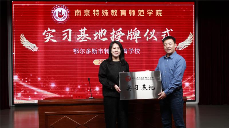 李拉院长和王晓红校长在内蒙古鄂尔多斯市特校、准格尔旗特校及达拉特旗特校三所特校教师们的见证下,共同签署了《南京特殊教育师范学院实习基地协议》,并举行实习基地签约授牌仪式。据了解,这也是我校在内蒙古自治区建立的第一所本科实习基地。