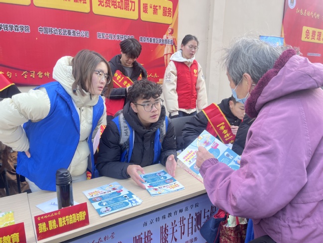 服务主要内容是颈椎、腰椎、膝关节的自测与保护。体育学院8名志愿者结合“运动损伤与康复”专业学习,通过颈部前伸、高低肩、骨盆倾斜、胸椎后凸角、腰椎前凸角、膝关节Q角、双侧腿对称、足弓塌陷、人体重心偏移、脊柱侧弯等指标,帮助前来咨询的老年人、青少年进行测试,以此判断他们颈椎等部位的健康情况。同时,志愿者通过发放宣传单,进一步提升老年人、青少年对颈椎、腰椎、膝关节的保护意识。