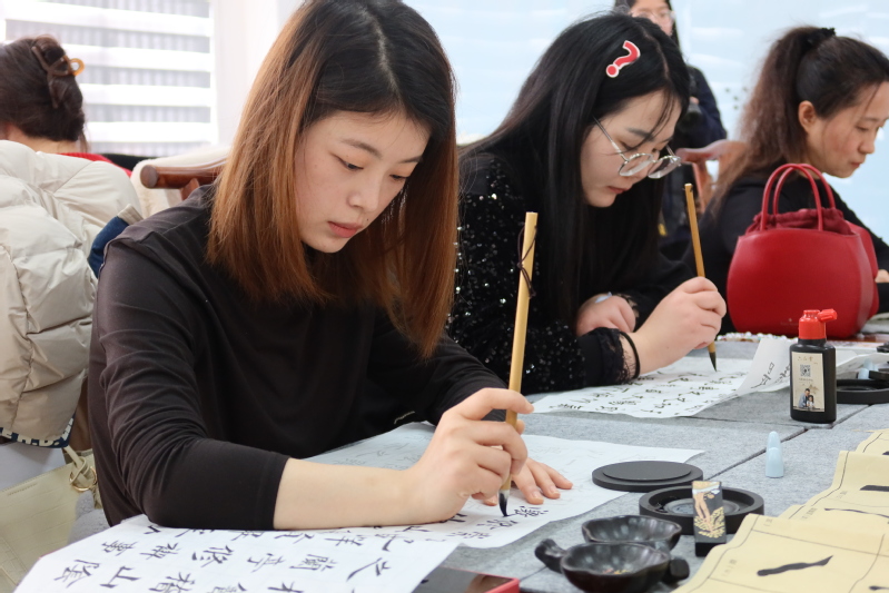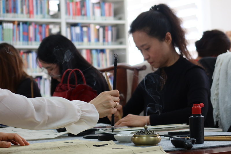 3月8日中午12点,由校工会与图书馆联合举办的“翰墨书香、习字雅集”活动在图书馆特藏室举行。校各分工会女教师代表约20多人参与活动。老师们端坐在中式桌椅前,凝神静气地书写。李斯的小篆《泰山刻石》帖、王羲之的行草《兰亭序》帖,在老师们的笔下或端正工整,或遒劲洒脱,逐渐呈现在宣纸上。伴随着悠扬的古琴声,时间仿佛静止了一样。