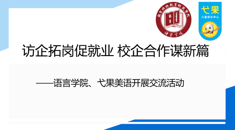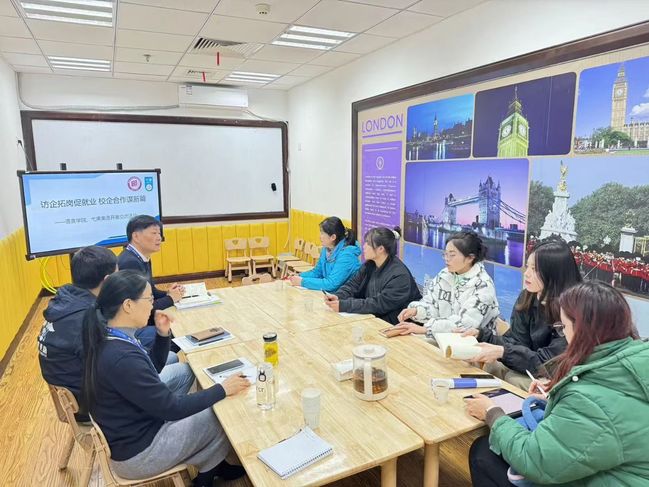 弋果美语总经理武装详细介绍了企业的发展现状、长远规划、人才需求等方面的基本情况,并围绕校企合作、人才培养、岗位需求等方面进行了座谈交流。座谈会上,张冬冬副书记介绍了学院的发展历程及近年来在学科建设、人才培养、社会服务和就业创业等方面取得的成绩。并表示希望通过交流洽谈,建立就业合作通道,围绕学生实习实践、就业指导、教学研究以及中教培养等方面开展广泛深度合作,为毕业生挖掘更多岗位资源。