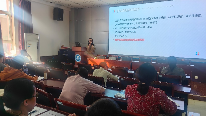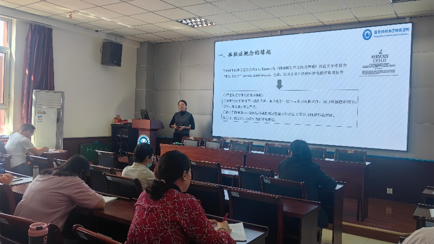 王磊老师为特校全体教师开展主题为“孤独症的定义及研究历史”的讲座。她介绍了孤独症的概念、多次精神病学诊断定义的更新,以及发展至今日的文化主体性孤独症概念。这有助于特殊学校教师进一步丰富其理论框架,为后续课题研究提供支持。屈可铮老师开展“回合式教学的理论与实操”主题讲座,结合丰富的案例视频和现场演示,帮助教师们更加深入地了解这一常用的孤独症儿童教学程序。